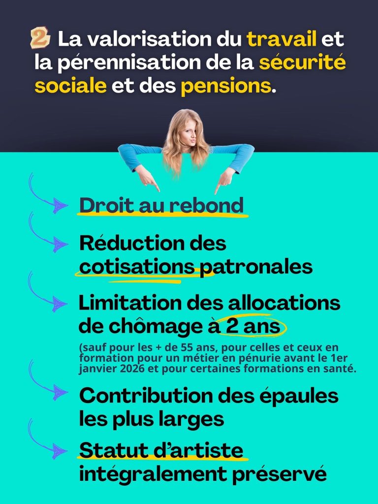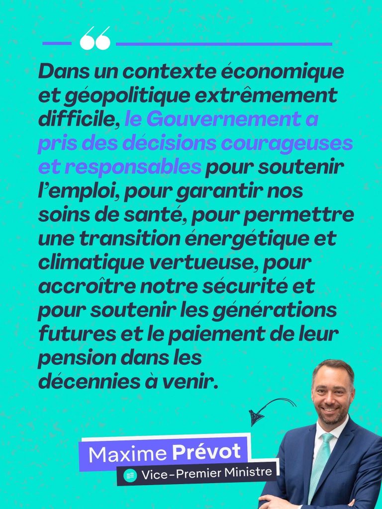 Il s’agit des premiers résultats concrets de l’Arizona qui mettent en place les réformes promises et attendues après des années d’immobilisme. Dans un contexte économique et géopolitique extrêmement difficile, le Gouvernement a pris des décisions courageuses et responsables pour soutenir l’emploi, pour garantir nos soins de santé, pour permettre une transition énergétique et climatique vertueuse, pour accroître notre sécurité et pour soutenir les générations futures et le paiement de leur pension dans les décennies à venir.